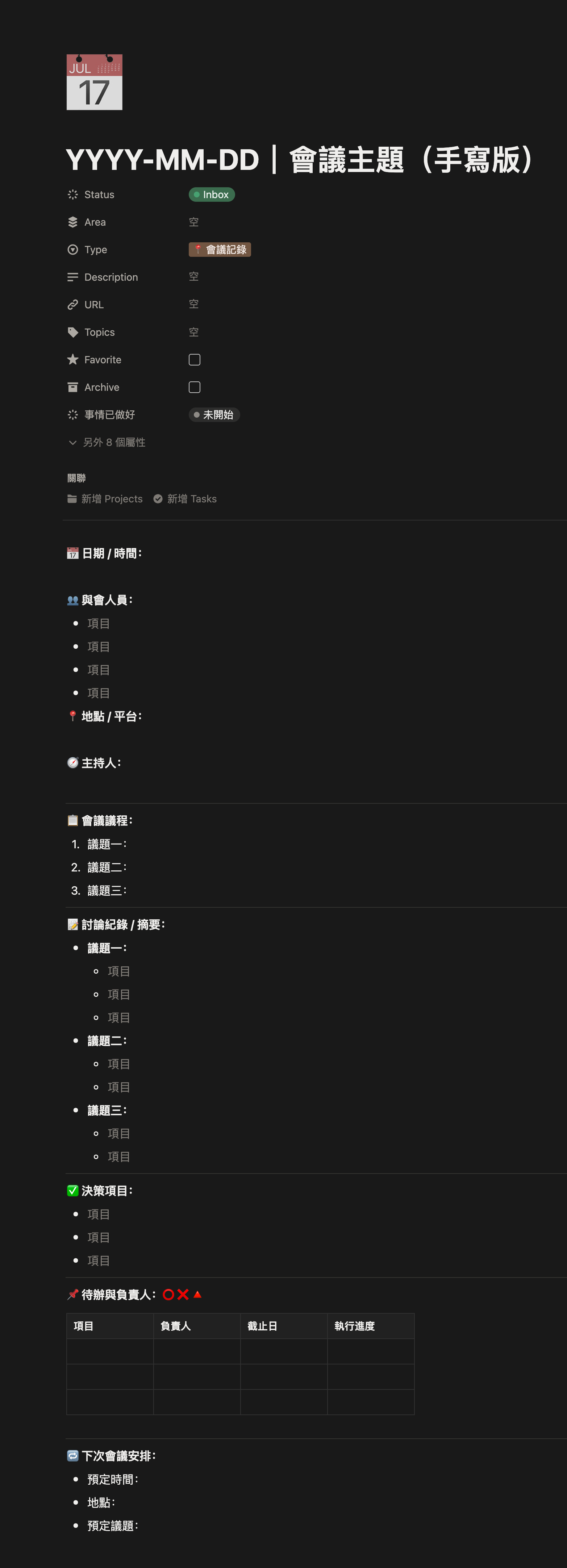 而我的直覺就是建立下面這個 Notion 模板,甚至做了捷徑讓我可以一鍵建立⋯