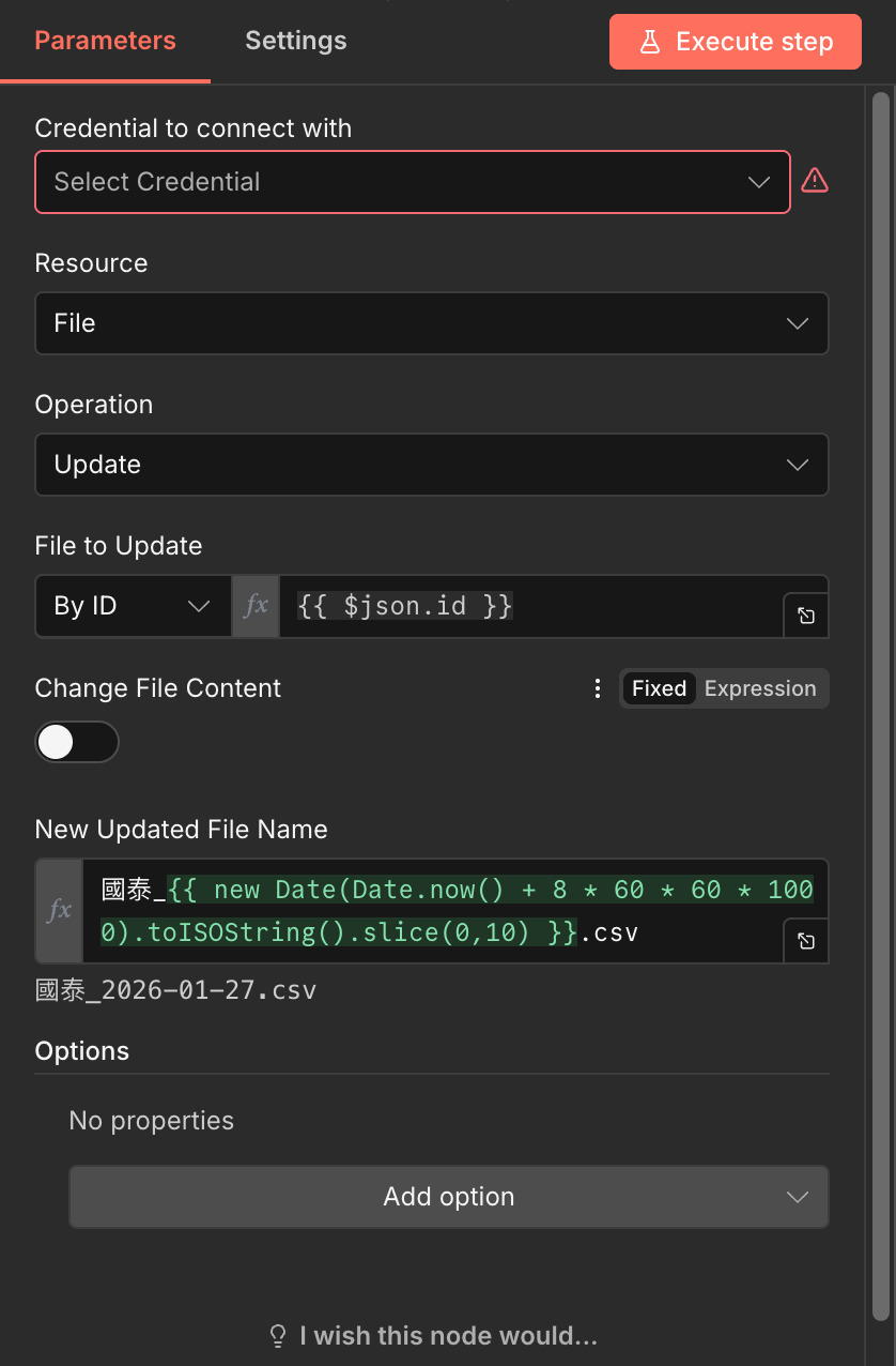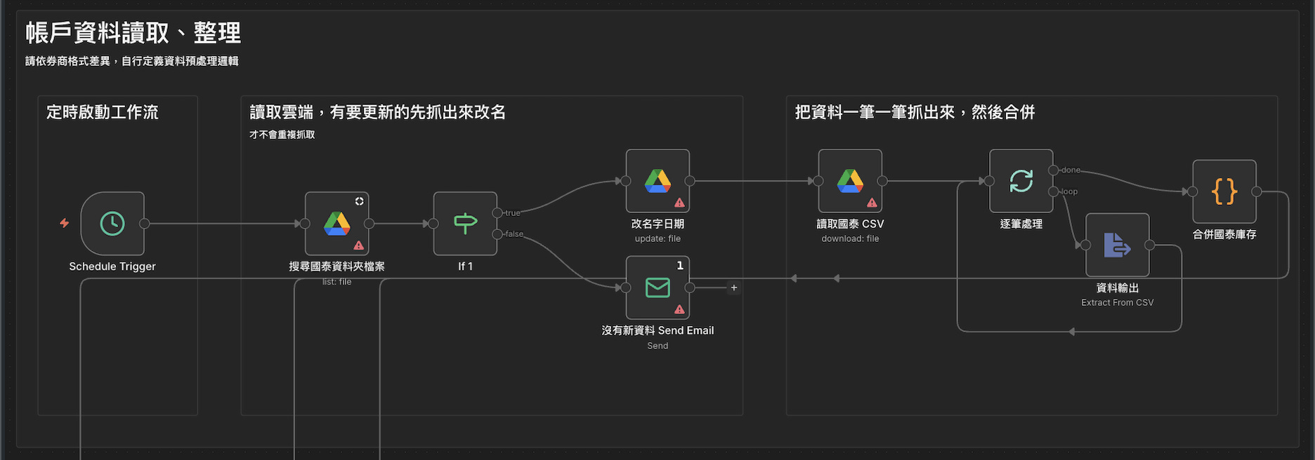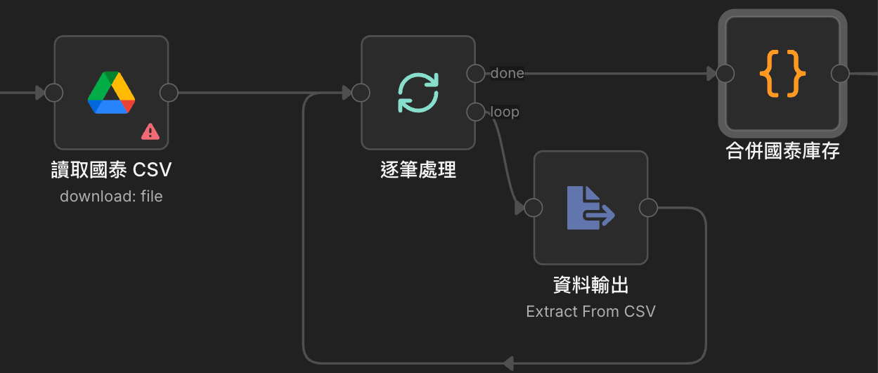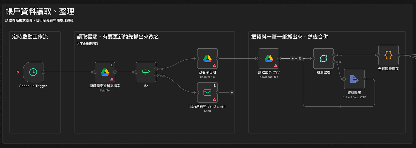 說明:我們會透過 定時掃描 指定的 Google 雲端資料夾,透過 檔名 找到要計算的檔案,找到之後先把名稱改掉,避免下次又找到重複的。接著將裡面的數據拆開、合併成 n8n 讀取的格式。