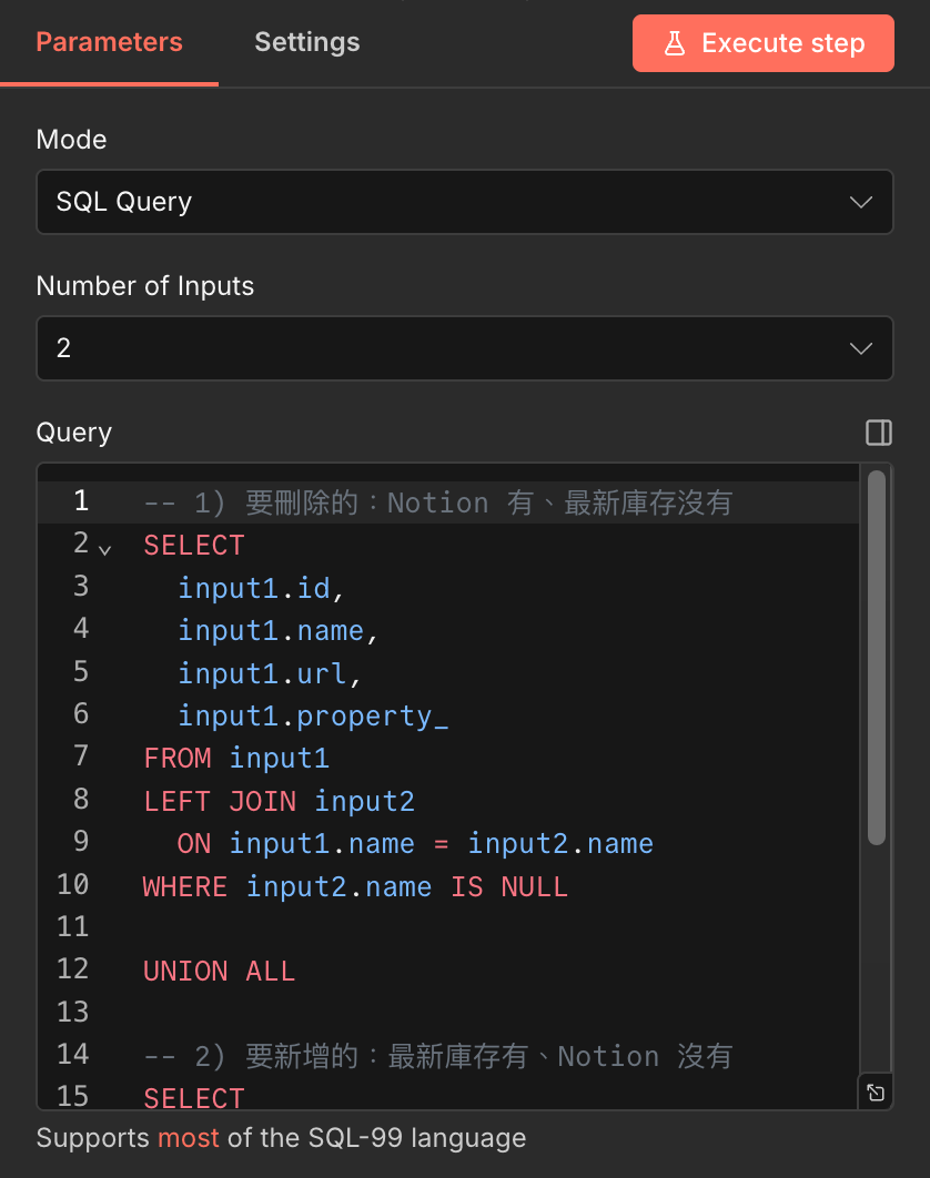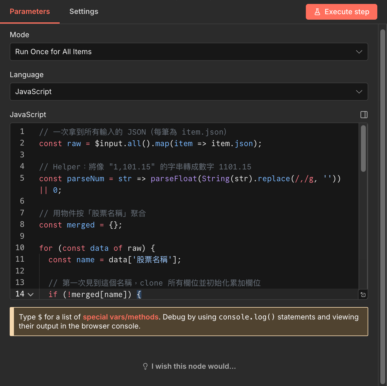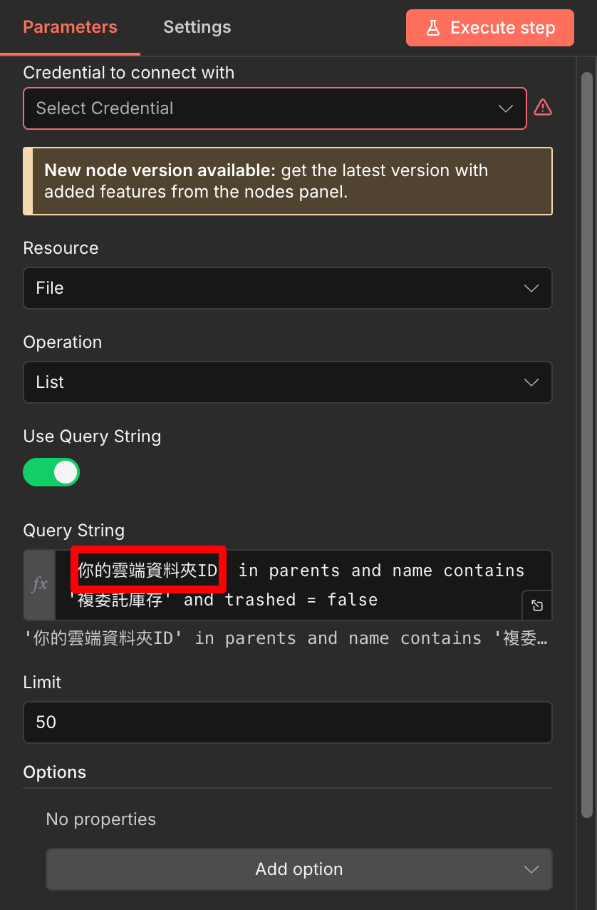 說明:我們會透過 定時掃描 指定的 Google 雲端資料夾,透過 檔名 找到要計算的檔案,找到之後先把名稱改掉,避免下次又找到重複的。接著將裡面的數據拆開、合併成 n8n 讀取的格式。
