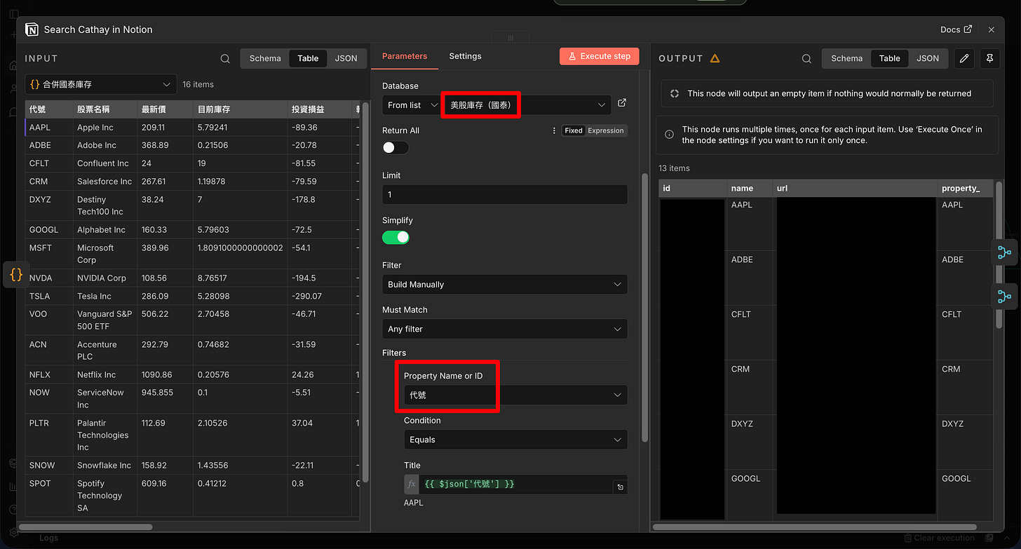 選擇要寫入的 Notion 頁面,並且只篩選出前一個節點也有的股票代碼
