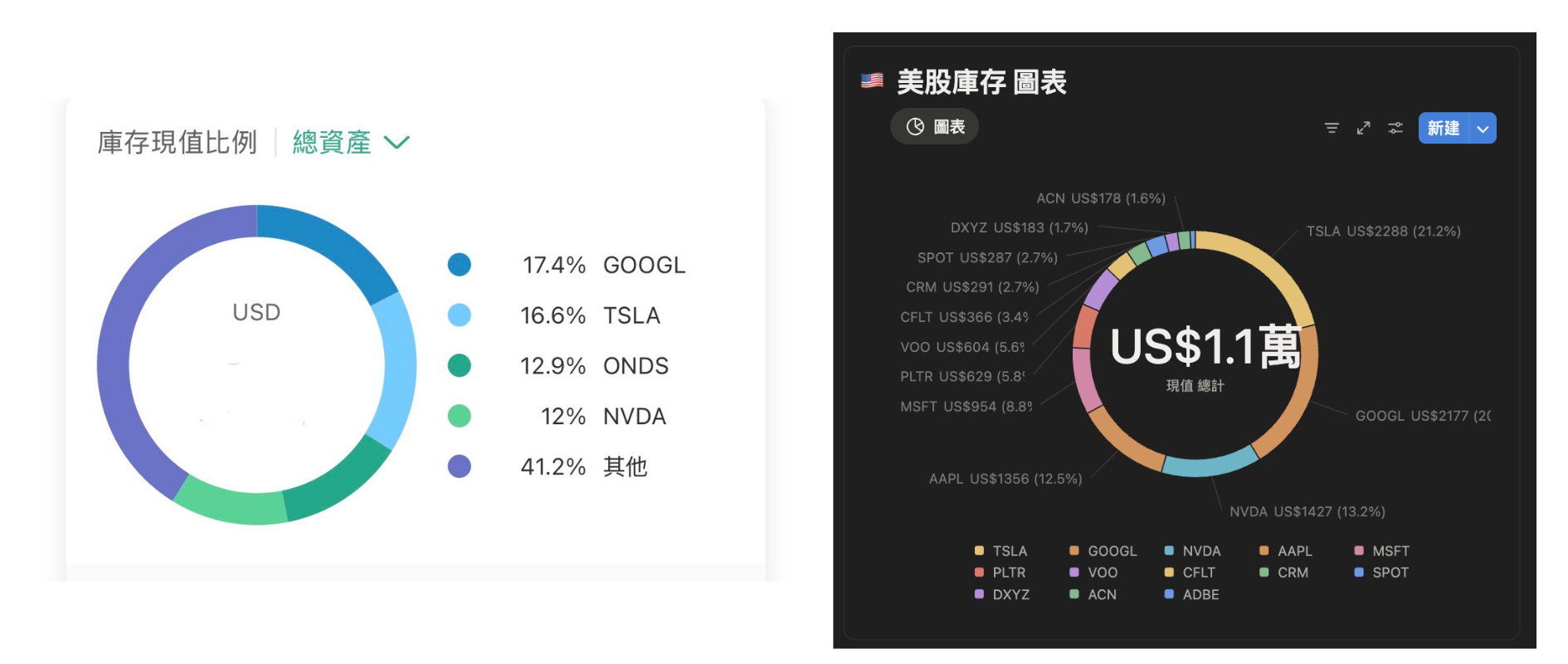 因為這套就是我為了把這兩個帳戶合起來而做的,下方左邊是國泰的圓餅圖,僅會顯示前四大持倉,剩下的通通算「其他」