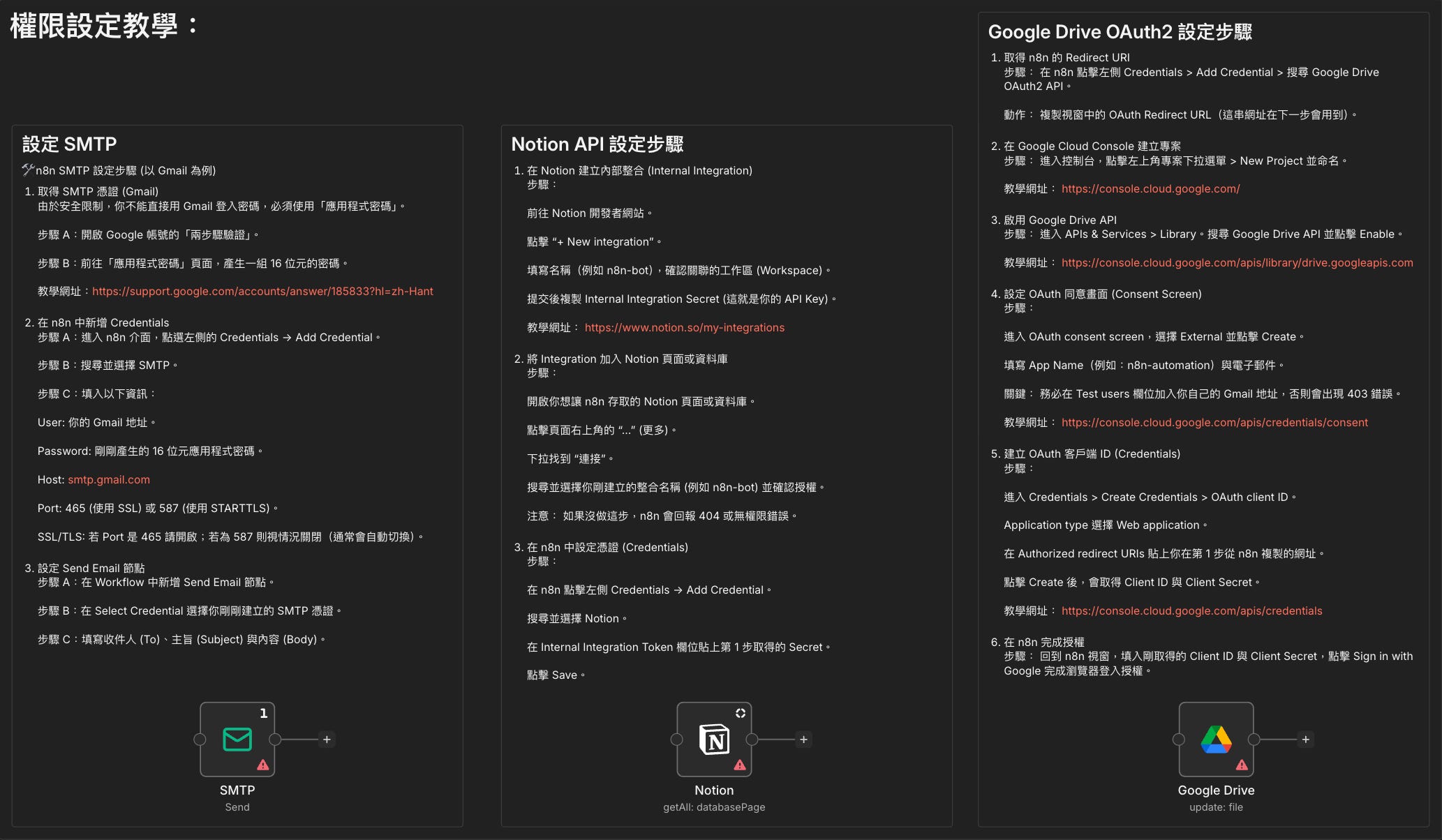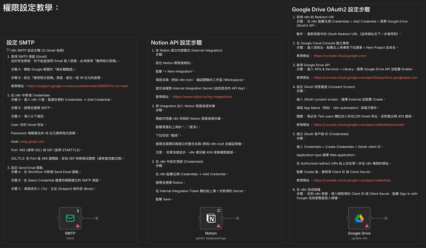然後先把權限設定好,你會需要設定 SMTP(發信給自己)、Google Drive OAuth2(讀取雲端的資料)、Notion API(寫入 Notion 的權限)