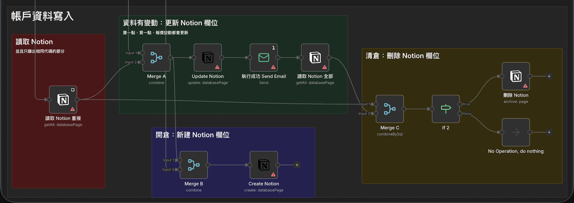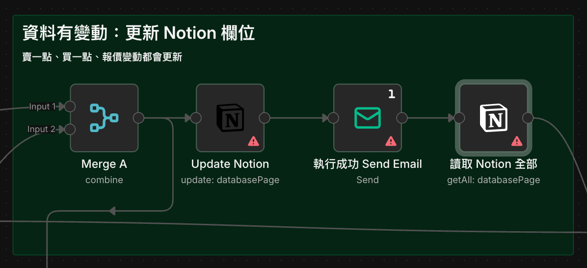 - 變動:更新 Notion 欄位(報價變動、買一點、賣一點都在這處理)