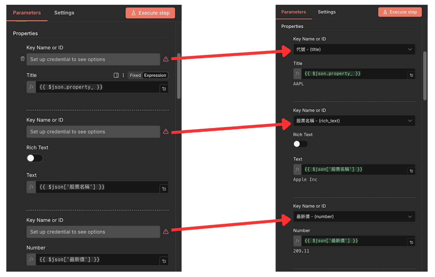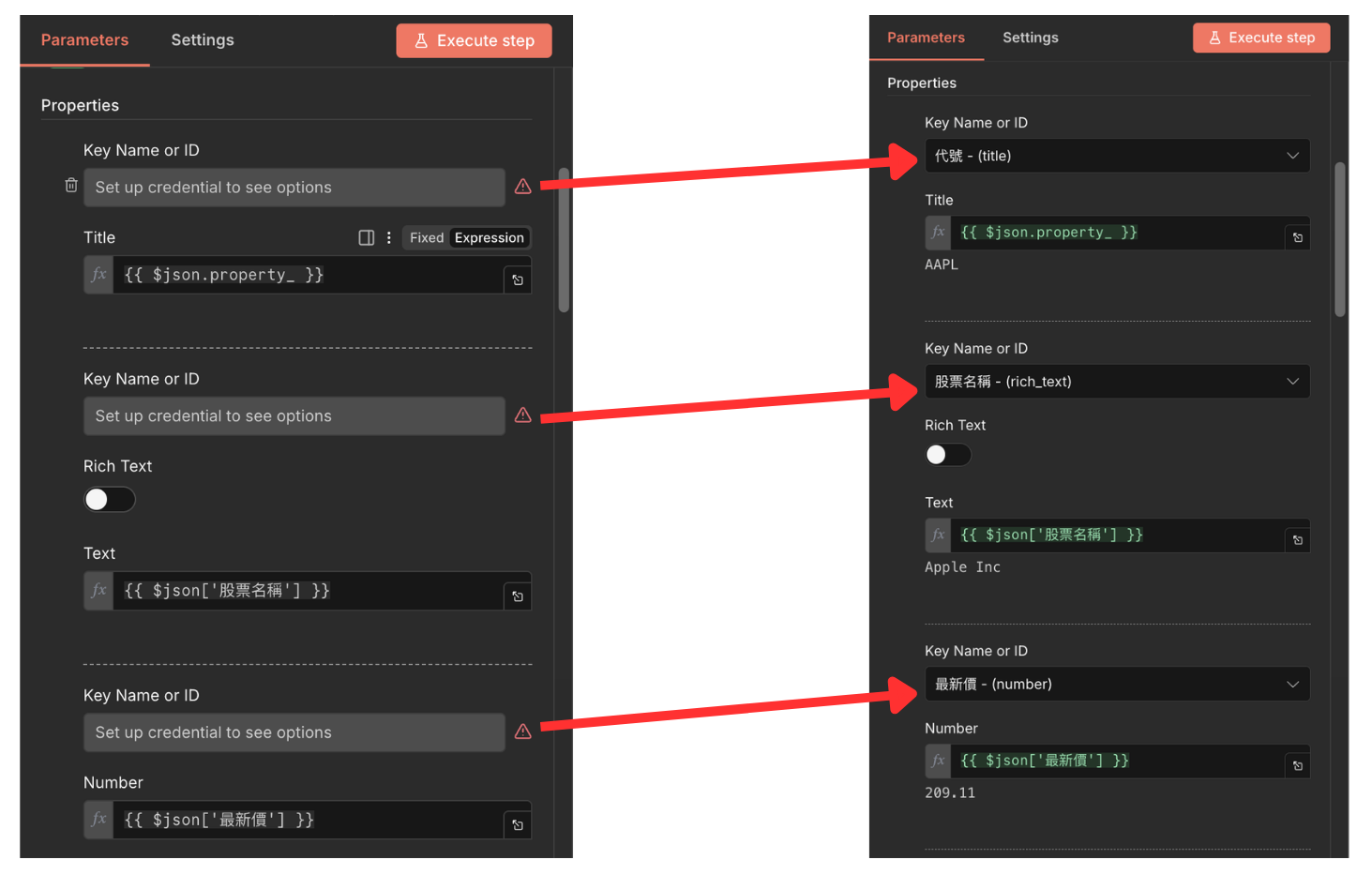Update Notion:把新資訊更新上去!前面有成功讀取到 Notion 頁面的話,左邊 Key Name or ID 會變成下拉式選單,這邊要依序配對,選完會像右邊那樣