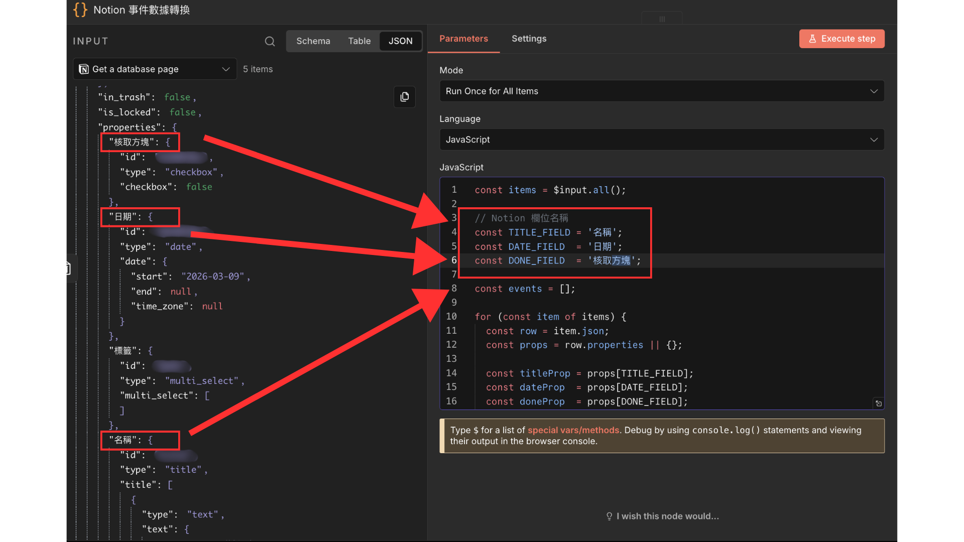 這邊很重要,請你把紅框上的「名稱、日期、核取方塊」替換成你 Notion 上顯示的「標題名稱、日期名稱、勾選框名稱」,你也可以在左邊的輸入找到他們,字要一模一樣!