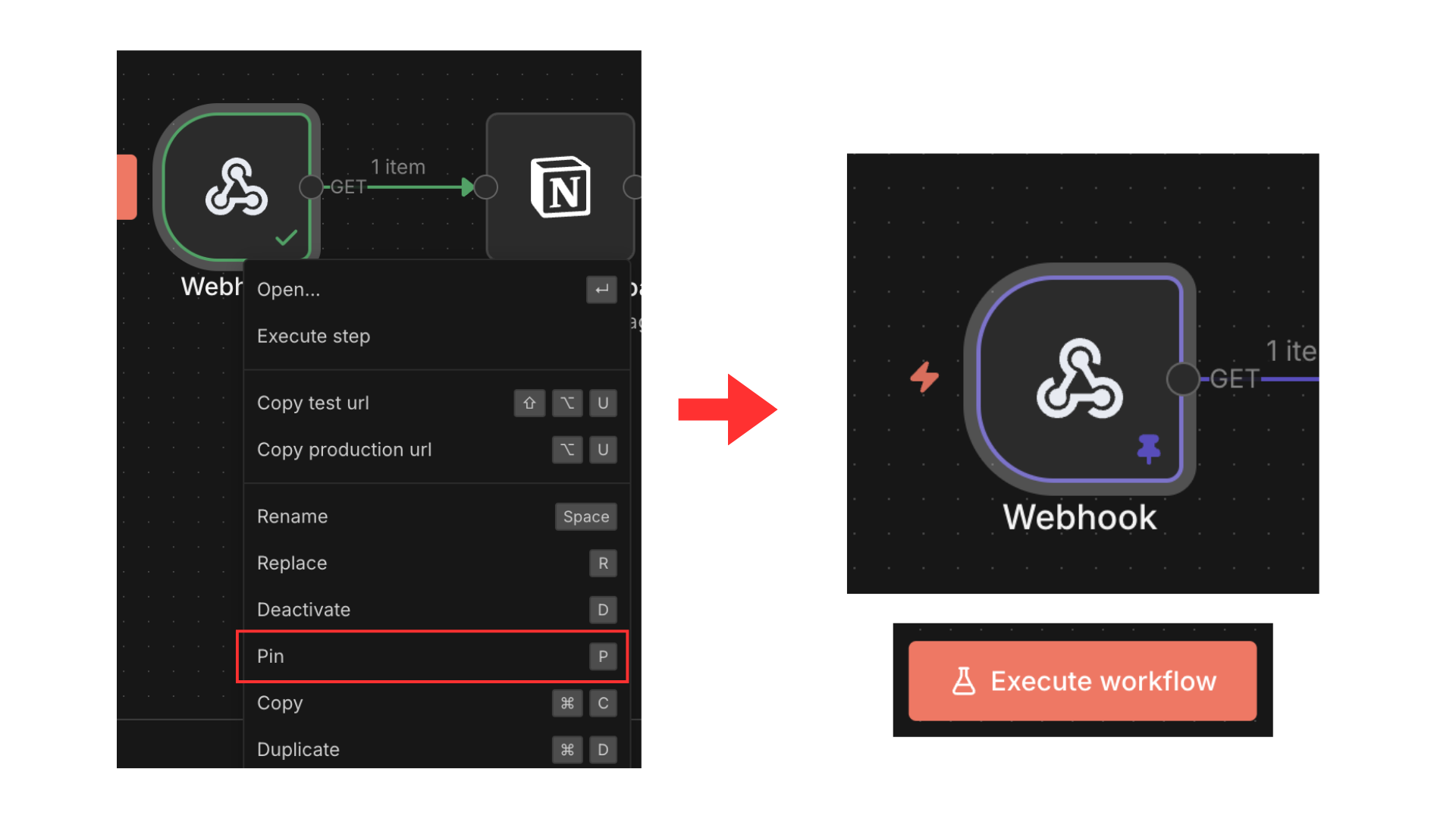 接著點擊右鍵選擇 Pin 釘選起來,接下來執行工作流就會直接跳過這個步驟,不需要再開分頁貼網址