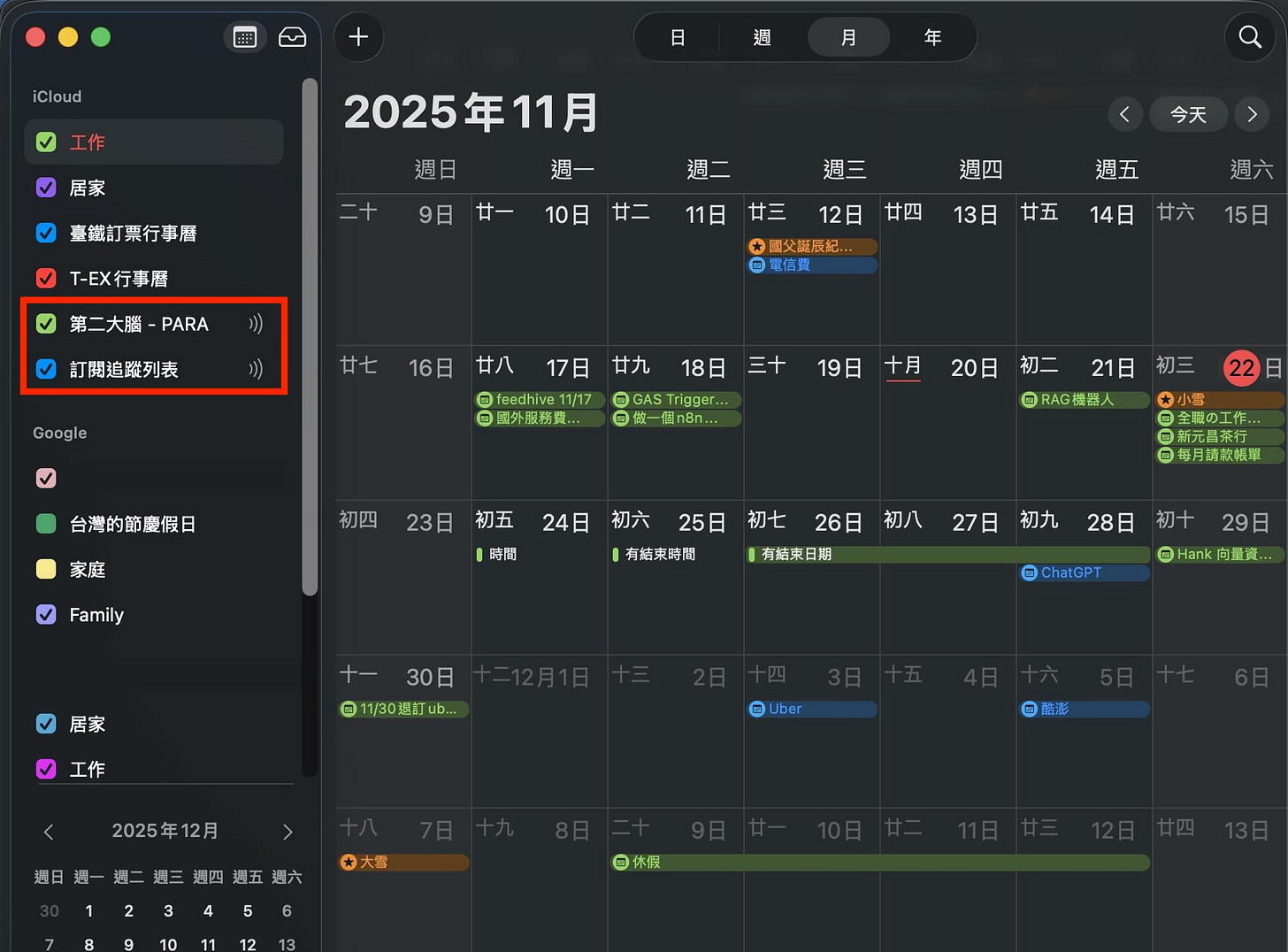做完之後長成下面這樣,簡單來說就是把 Notion 任務項目上的時間做成 .ics 檔案來訂閱,這樣所有不同行事曆都能在同一個介面顯示,不用到處切來切去太棒了~~