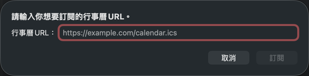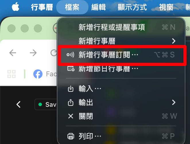 點選 行事曆 > 檔案 > 新增行事曆訂閱