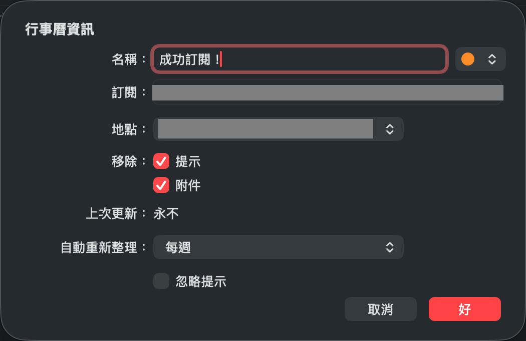 恭喜!這次正式成功啦!你可以在「自動重新整理」設定執行頻率,但其實每次開啟行事曆好像都會自動執行一次就是了~